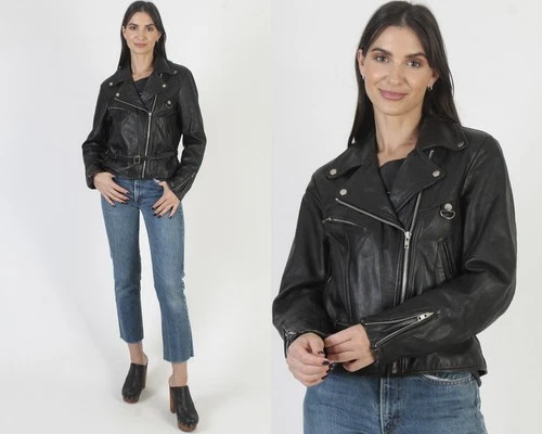 Vtg Womens Black Leather Motorcycle Jacket Belted Asym Zip Biker Moto Waist Coat