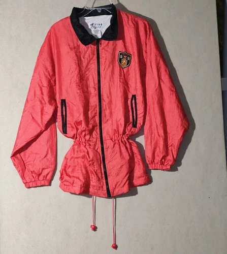 Vintage 80s Windbreaker Jacket Large Red Cinched Waist Coat of Arms Patch
