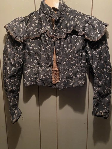 Victorian Edwardian Waist Coat Blazer Jacket Black Beige Cotton W/Lace 1890s