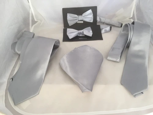 Shiny Silver Grey Collection of Hankies-Ties- Bow ties-Cravats-Cummerbunds +Sets