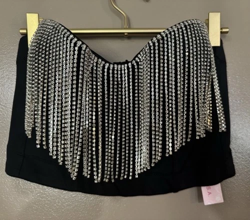 NWT Lydia USA Crystal Rhinestone Tassel Fringe Glam Black Bustier Crop Top Sz M