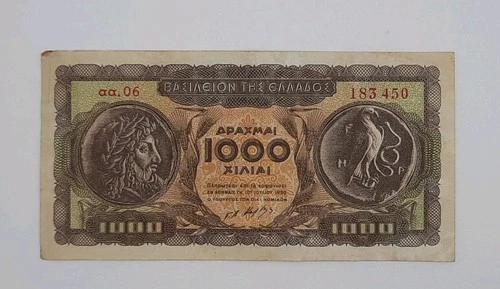 1950 Kingdom of Greece - 1000 Greek Drachmas Banknote Serial No. AA06 183450