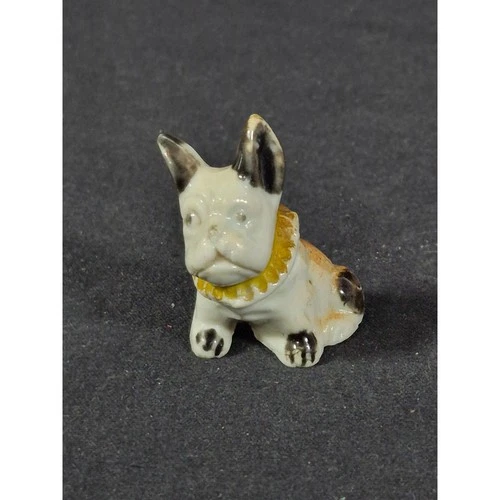 Vintage Miniature Porcelain French Bulldog Figurine Black White Yellow Collar
