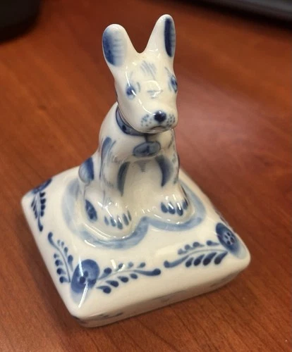 Vintage Hand Painted Porcelain French Bulldog Figurine Blue White Russian