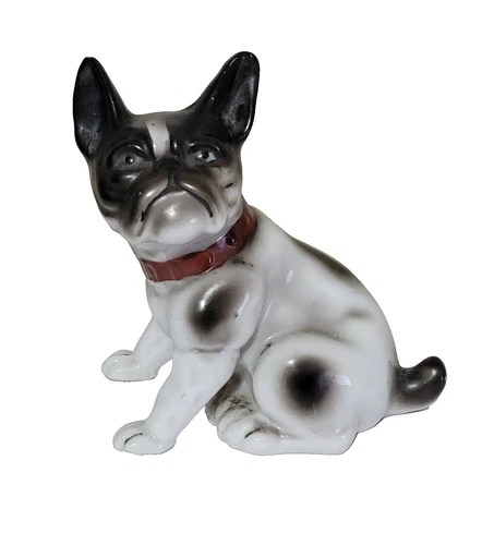 Vtg Bulldog Figurine Sitting Frenchie Black Gray Spotted Red Collar Japan 4.5"