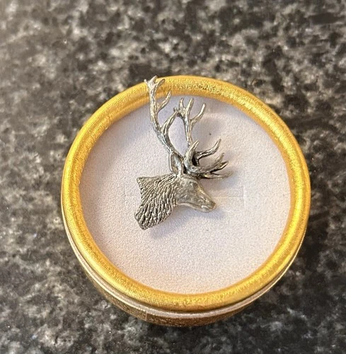 HUNTING STAGS HEAD PEWTER SIGNED A R BROWN PIN BADGE.