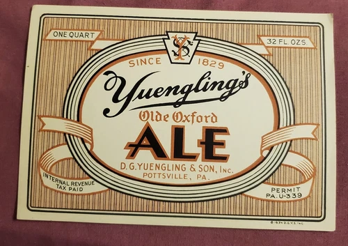 1930s Yuengling's Oxford Ale IRTP 32 OZ Permit U-339 Beer Label Pottsville Pa