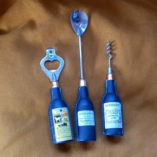 VINTAGE 1960s WHISKY BOTTLE DESIGN CORK SCREW/BOTTLE OPENERS/SPOON SET