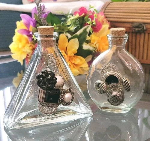 Marked Triangle Pyramid Bottle & Curved Jar Handcrafted Vintage Buttons Corks
