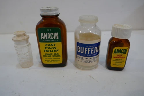 4 Diff Small Glass Medicine bottles Anacin, Bufferin & Bexel Paper Label Botles