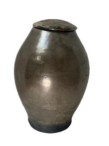 Abstract Design Urn 14 Inch with lid. Green and Grey glaze tone 14" h Unique