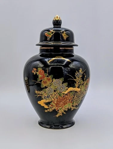 Vintage Black Lacquer Ginger Jar w Lid Gold Floral Asian Urn 8"