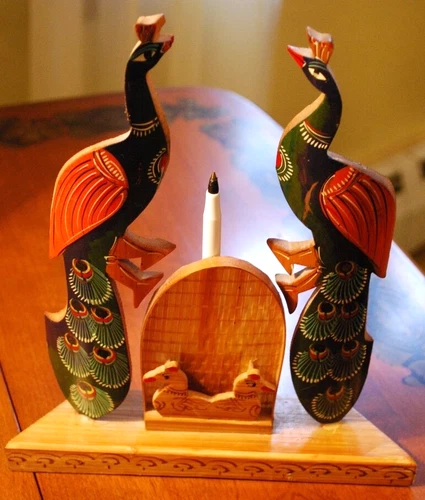 Vintage DOUBLE PEACOCK BIRDS Bamboo PEN HOLDER Hand Painted Hand Made In India