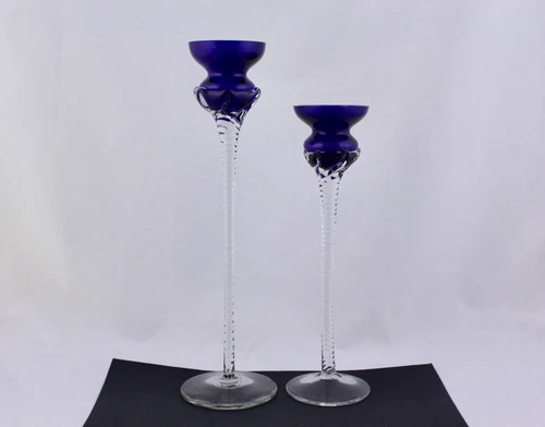 SET OF 2 ROMANIAN HANDBLOWN COBALT BLUE AND CRYSTAL-CLEAR CANDLE HOLDERS - MINT