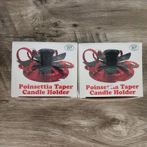 2 Vintage Metal Hermitage Pottery Poinsettia Taper Candle Holders Red & Green