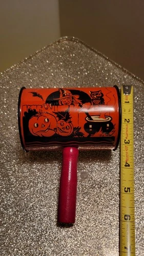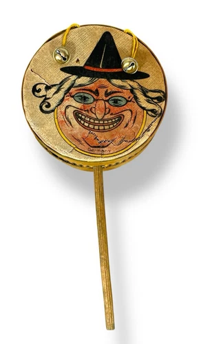 Vintage U.S. Metal Toy Mfg. Co. Tin Litho Noisemaker Witch Black Cat Halloween