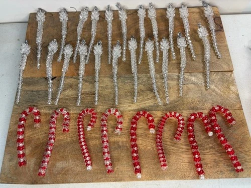 22 Vintage Christmas Clear Beaded Icicle Ornaments + 8 Candy Canes Handmade