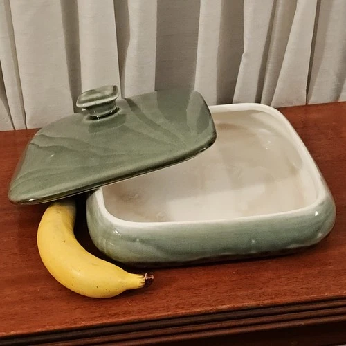 Vintage FAPCO Sage Green Drip over Adobe Square Ceramic Baking Dish w Lid