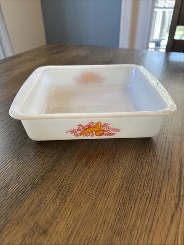 Vintage Mid Century Glasbake Milk Glass Casserole Pan Red/Yellow Fruit