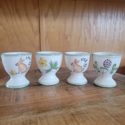Vintage Set Of Decorative Ceramic Egg Cups (4) 2" Bunnies Easter Spring