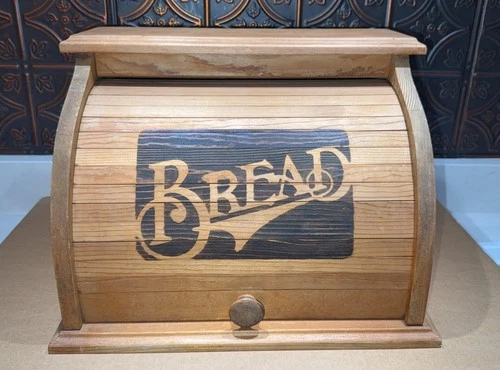 Vintage Antique Wooden Roll Top Bread Box with Wood Burned “BREAD” Lettering
