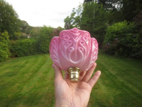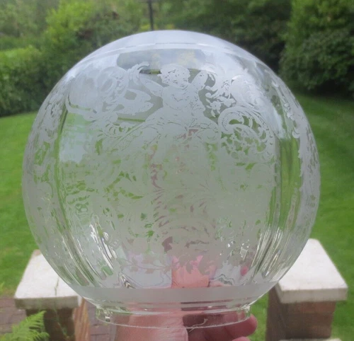 SUPERB DELICATE ORIGINAL ANTIQUE CHERUB RIBBED ACID ETCHED DUPLEX OIL LAMP SHADE