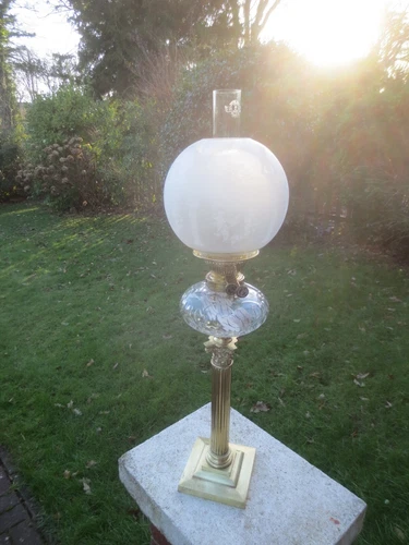 Antique Messengers Cast Brass Corinthian Column Oil Lamp & Acid Etched Shade