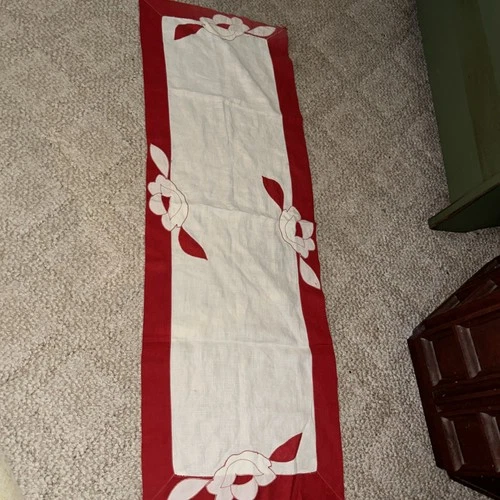 Vintage Linen Woven Textile Red White Dresser Scarf Table Runner 42" X 14" READ
