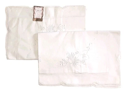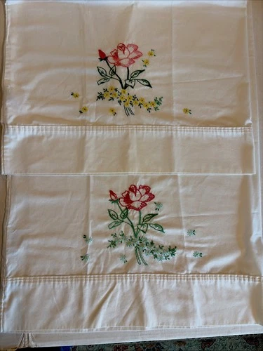 VTG Pair Hand Embroidered Rose Daisy Floral White Cotton Pillowcases Standard