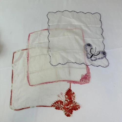 Vintage Handkerchief Lot 3 Butterfly Floral Crochet Lace Edge White Purple Pink