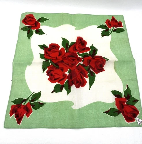 Vintage Herrmann Floral Handkerchief Red Roses Green Border Cotton 13x13