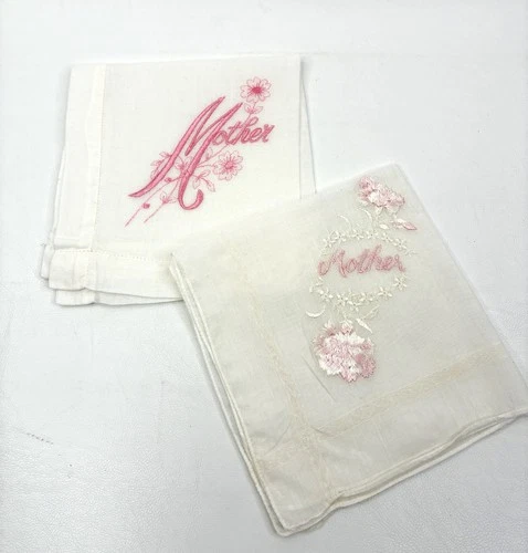 Vintage Mother Handkerchief Lot Embroidered Floral Linen 2pc Pink Script