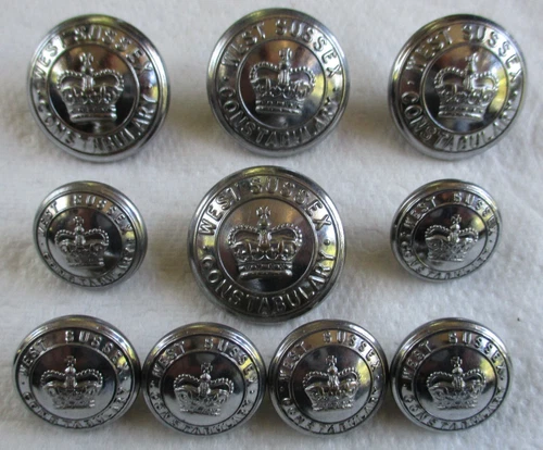 Obsolete, 10x British:"WEST SUSSEX CONSTABULARY BUTTONS"(24mm-17mm, 1950s-1960s)