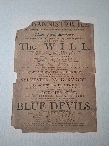 ORIGINAL THEATRE POSTER 1798,THE WILL,A COMEDY,THEATRE-ROYAL MANCHESTER