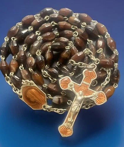Vintage Catholic Tigers Eye Stone Crucifix Rosary Gold 16.5”