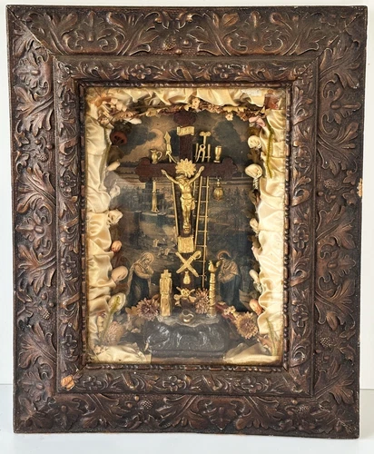 Antique 1877 Kingdom Come Religious Jesus Mixed Media Crucifix Diorama Shadowbox