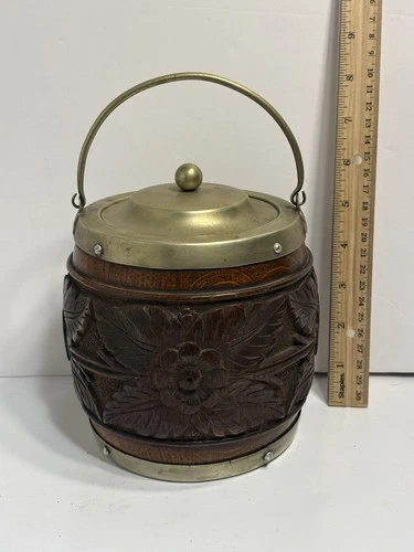 Antique Victorian Flower Carved Wood Silverplate Ornate Tobacco Jar Humidor