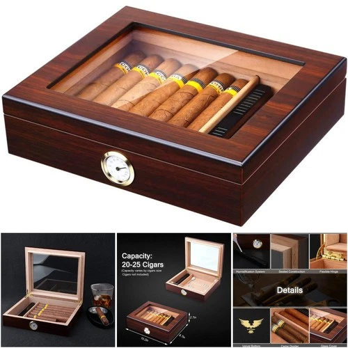 Cedar Cigar Desktop Humidor 20-25 Cigars Glass Top Humidifier Hygrometer