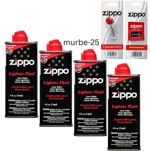 4x Genuine Zippo Lighter Fuel 125ml Fluid Petrol + 1 Wick + 1 Pack 6 Flints UK