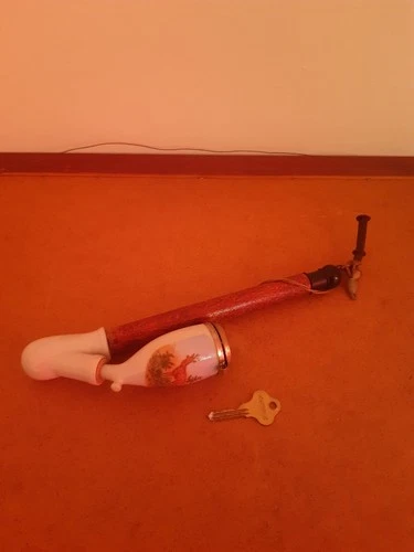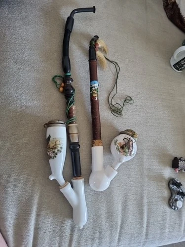 Large Vintage Decorative Pipe – Wooden Stem & Ceramic Bowl – Hand Painted Scene