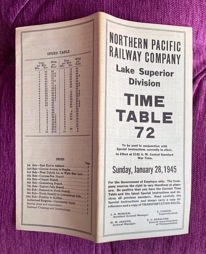 Northern Pacific Railway 1/28/45 Employee Timetable:Lake Superior Division