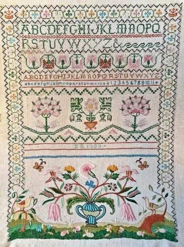 ANTIQUE AMERICAN SILK CROSS STITCH EMBROIDERED SAMPLER 1933