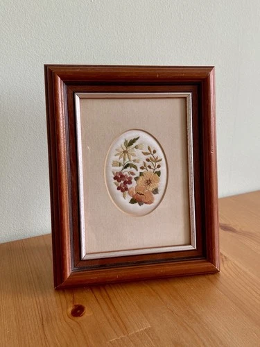 Vintage Floral Embroidery Needlework Framed Decor Cute Nature Handmade 19x24cm