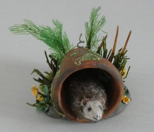 DOLLS HOUSE FURRY HEDGEHOG IN FLOWERPOT OOAK HANDMADE 1:12th SCALE