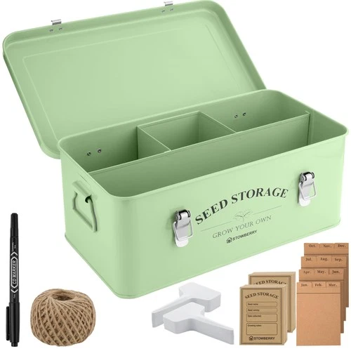 Seed Storage Box Organiser - Green Garden Seed Box with Lid, Side...