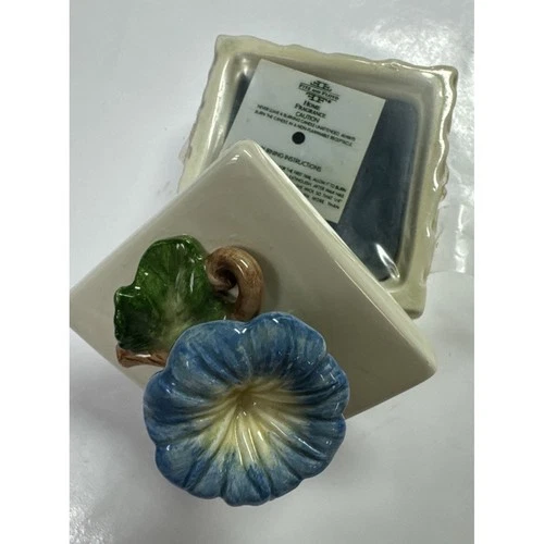 Fitz and Floyd Morning Glory Blue Flower Ceramic Candle Box Basketweave Cream