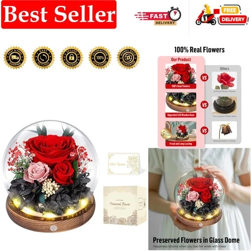 Preserved Roses in Glass Dome with LED Light - Long Lasting Real Flowers, For...