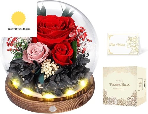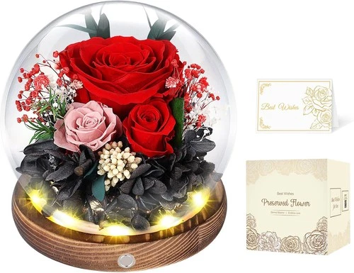 Preserved Roses in Glass Dome with LED Light - Long Lasting Real Flowers, Foreve
