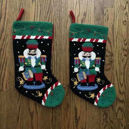 Christmas Stocking Black Background Nutcracker Handmade Hooked Rug One Of Two