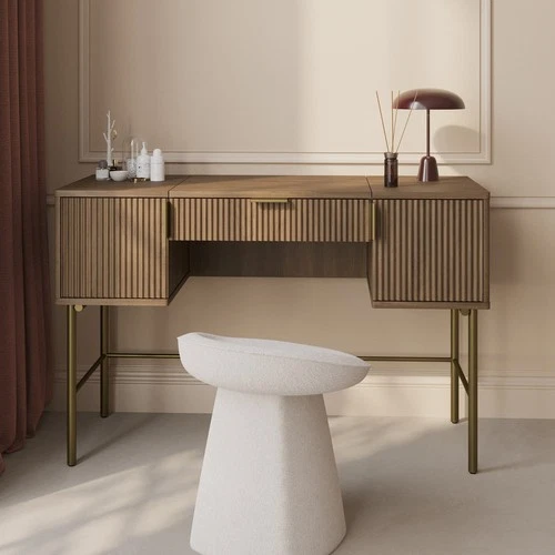 Dark Oak Ribbed Dressing Table with Storage and Fold-Out Mirror - Valenci VLC028